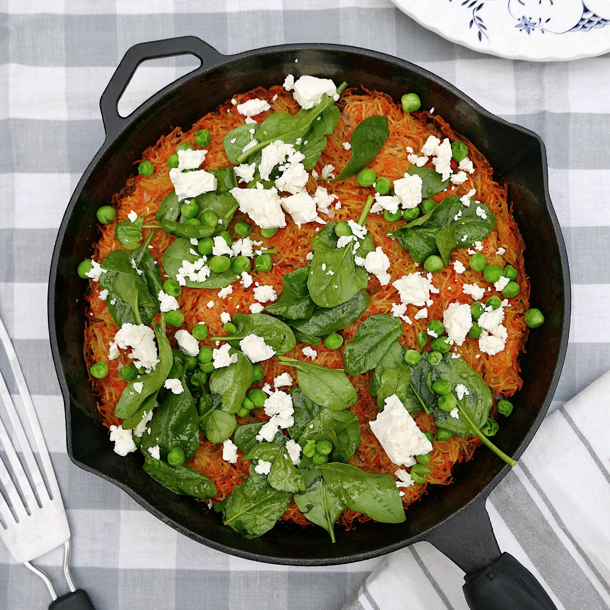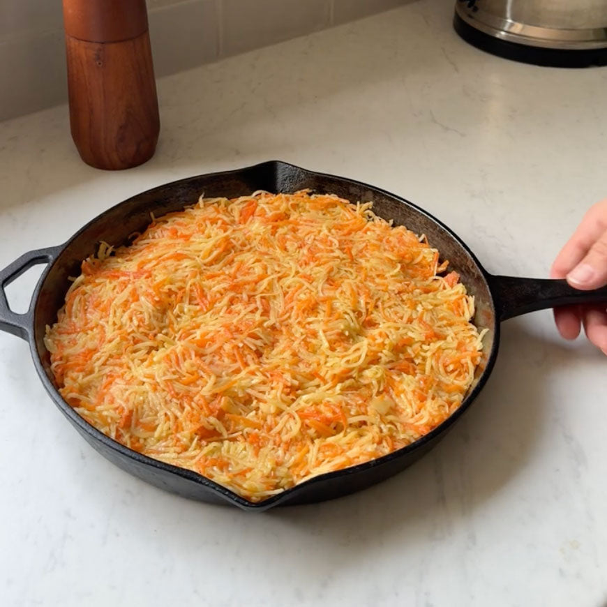 This golden, crispy baked rosti is the perfect weekend dish for using up whatever’s left in your veggie drawer. It’s simple, wholesome and endlessly adaptable. Mix in your favourite greens, swap the carrots for kumara or add any herbs you have on hand. Delicious hot from the oven or as leftovers the next day.