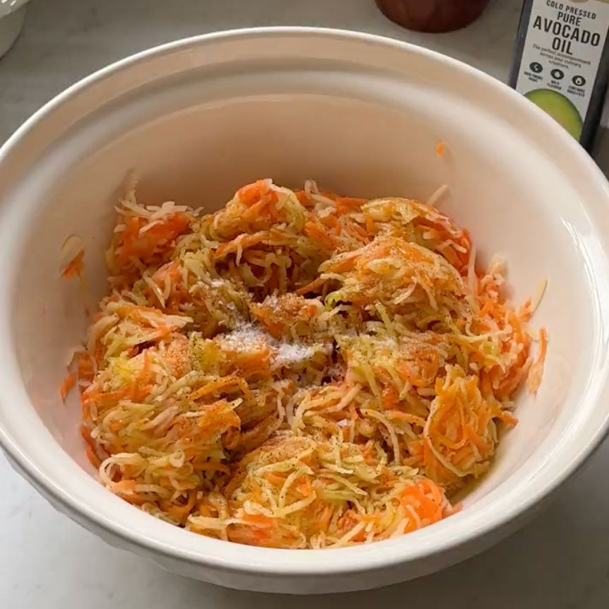 Drizzle a generous amount of oil into a large bowl and add a good pinch of pepper. Squeeze out handfuls of the grated veg to remove excess liquid (or use cheesecloth), then add to the oiled bowl and toss well to coat.