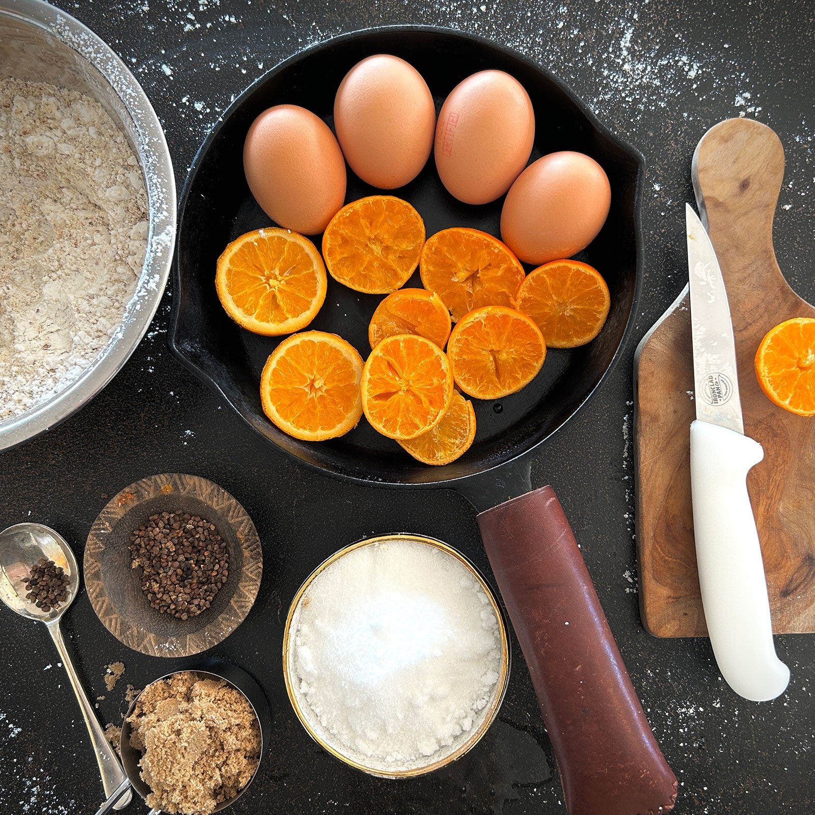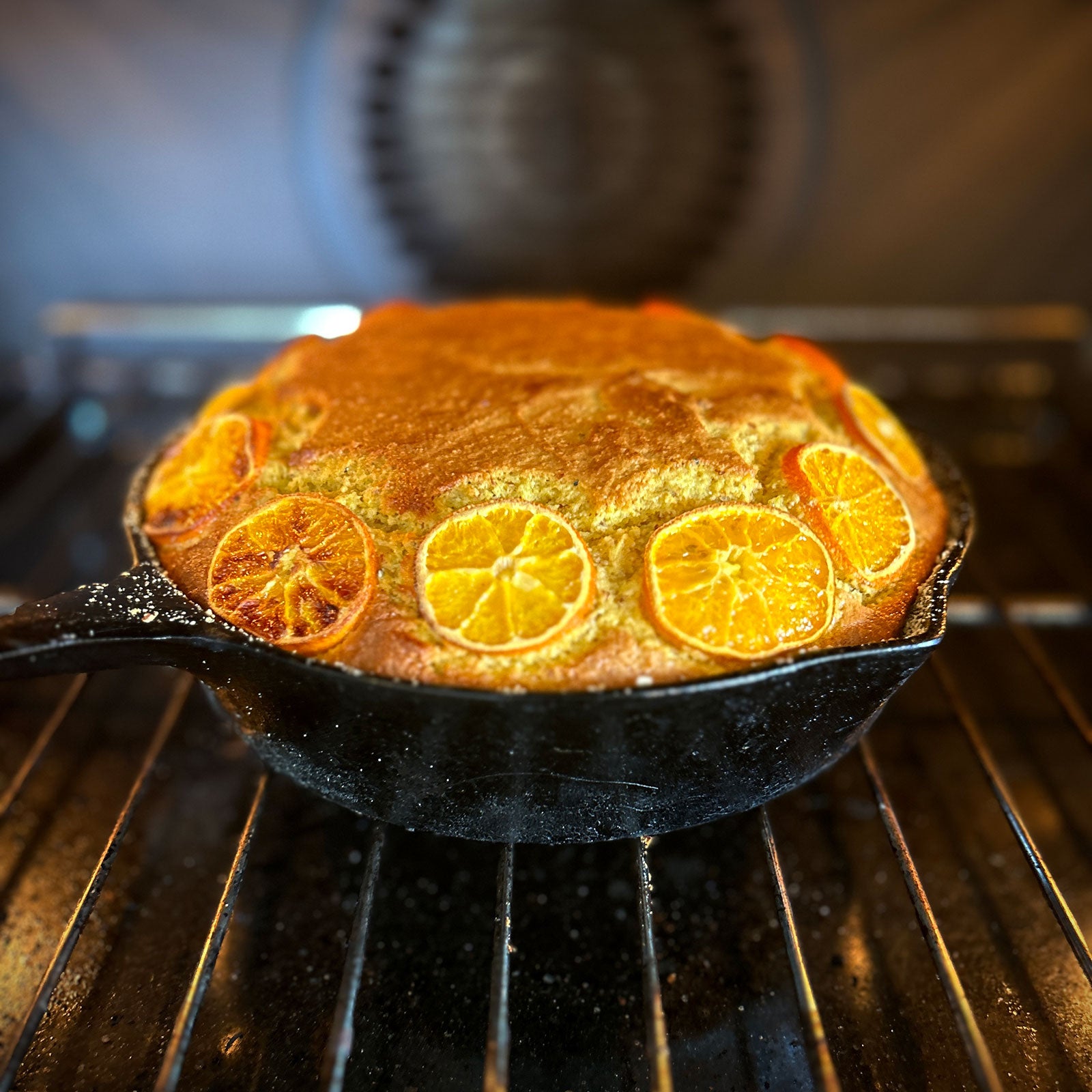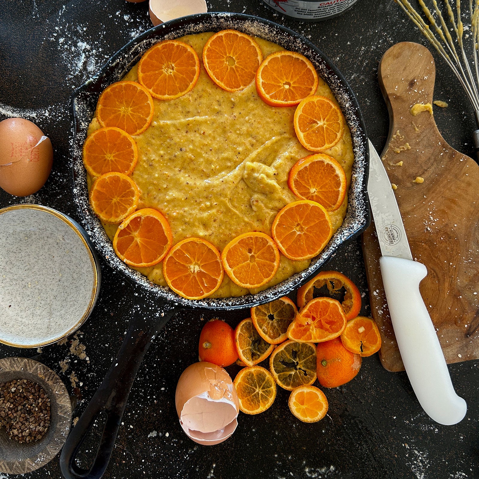 Whisk dry ingredients into the creamy orange mixture and pour into the prepared pan. Arrange mandarin slices neatly around the top edge and bake for 35 minutes until puffed, golden and cooked through.