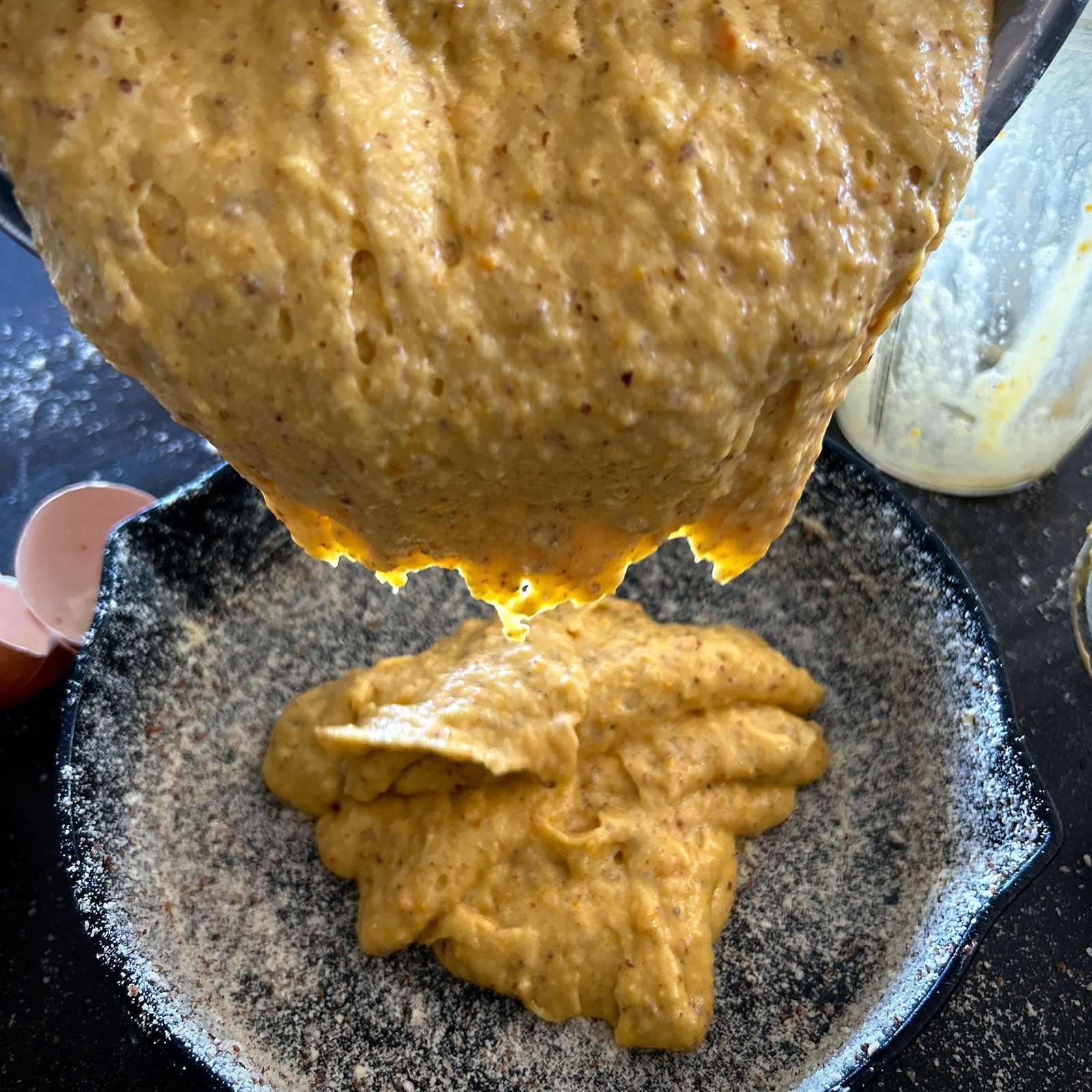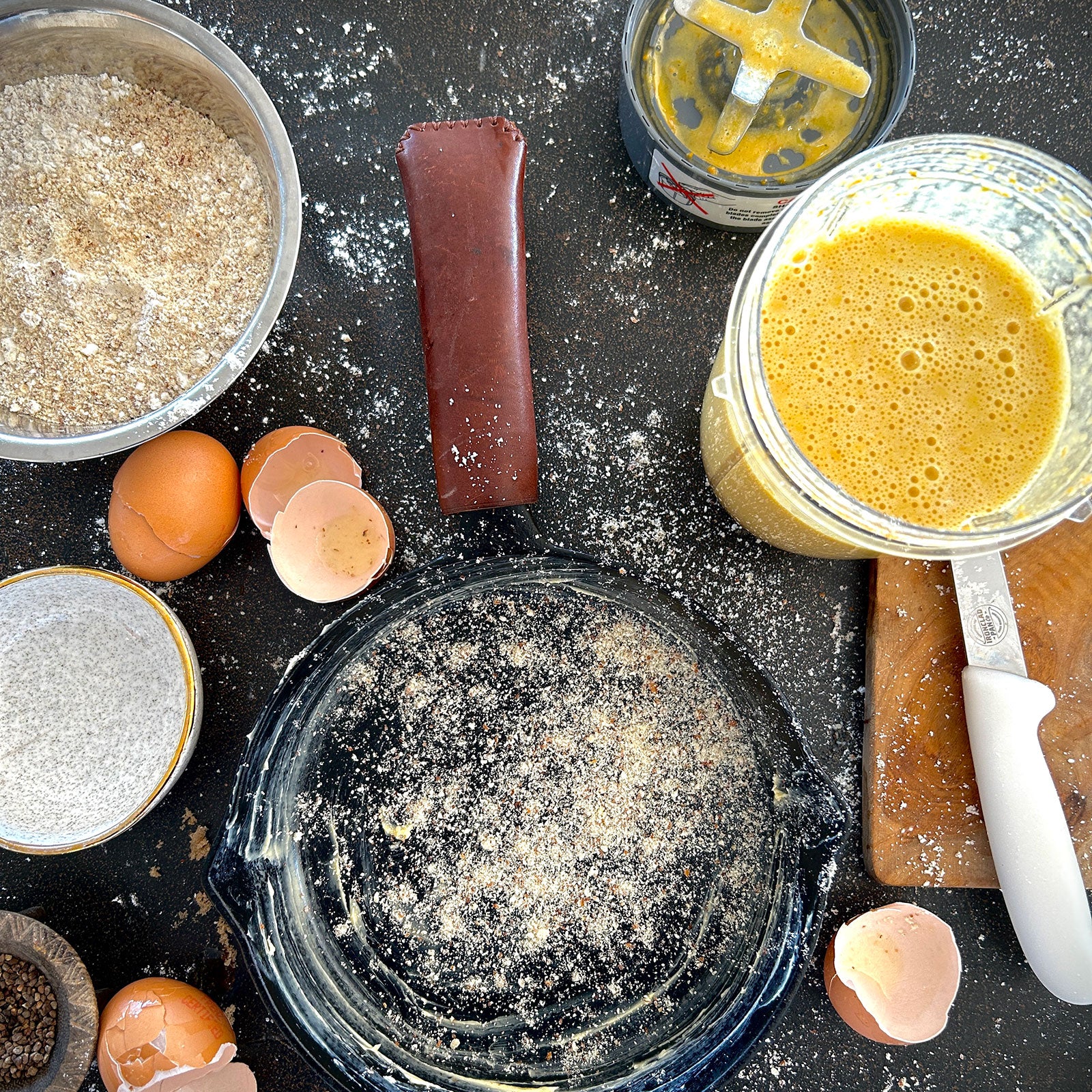 Sift the gluten free flour and baking powder into the ground almonds. Grease your Lil’ Legacy Pan with butter or olive oil and liberally dust with ground almonds.