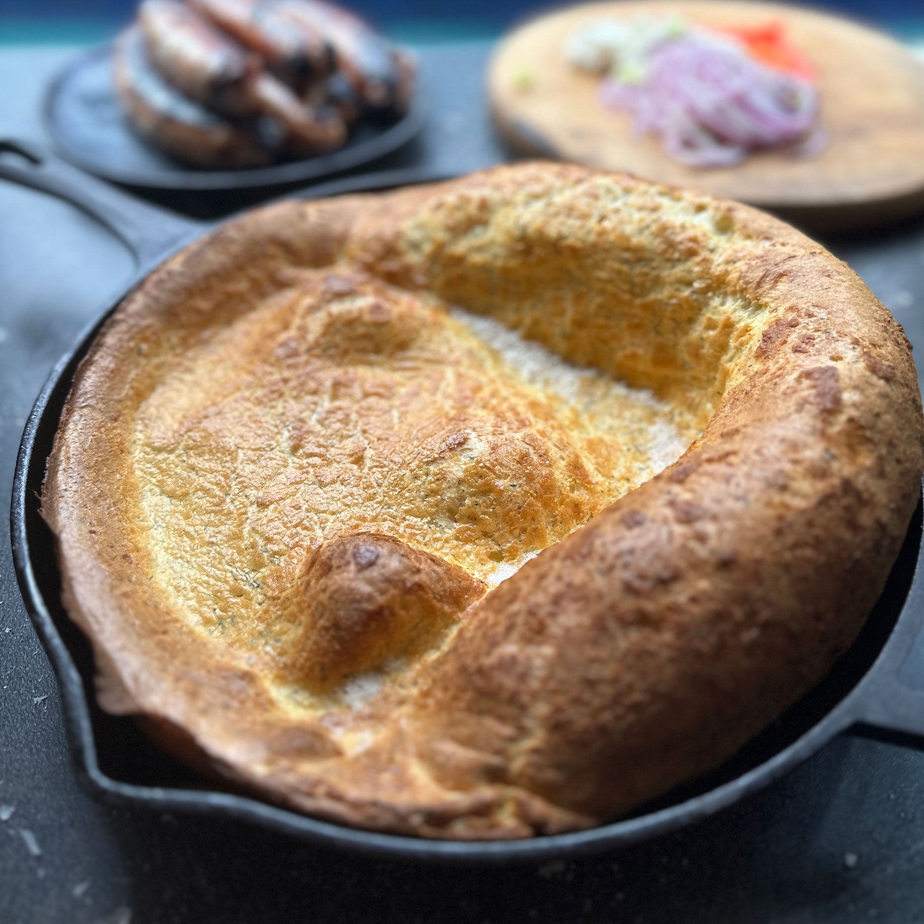 As the Dutch Baby cooks, barbecue the sausages.