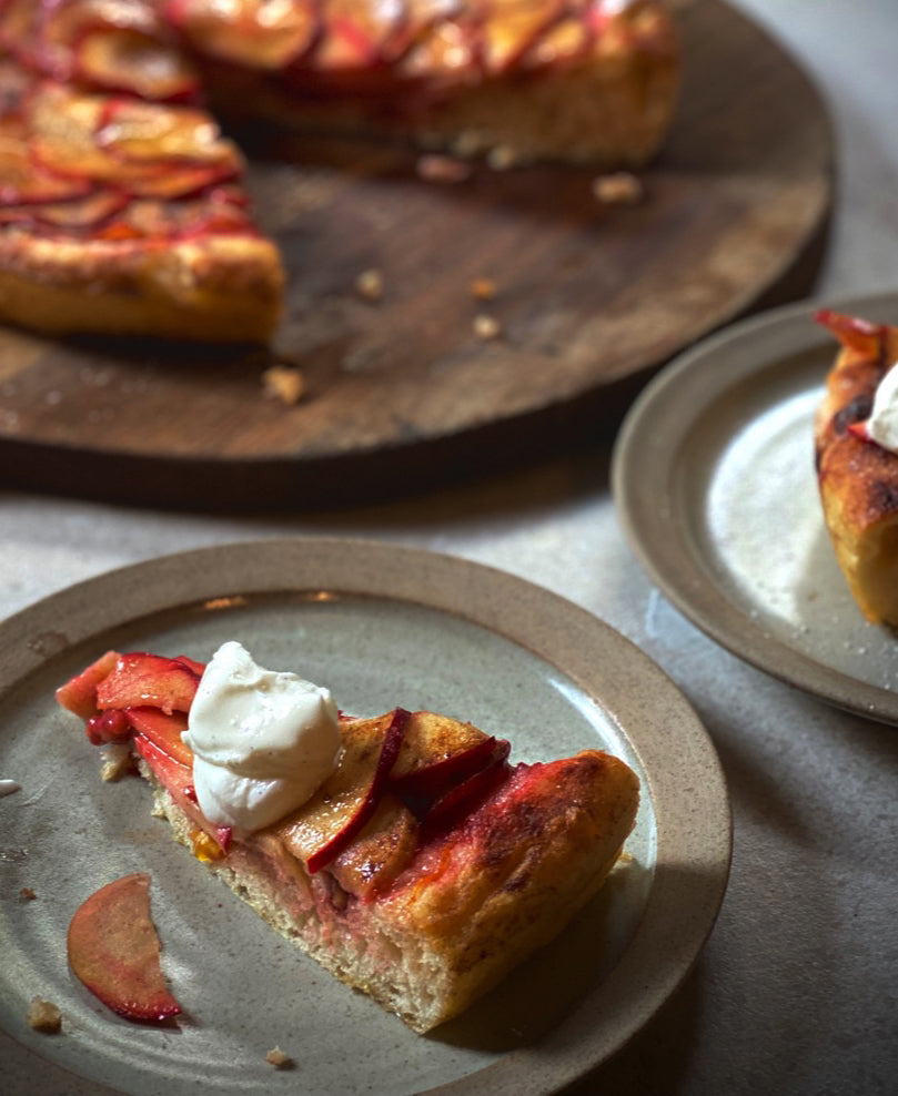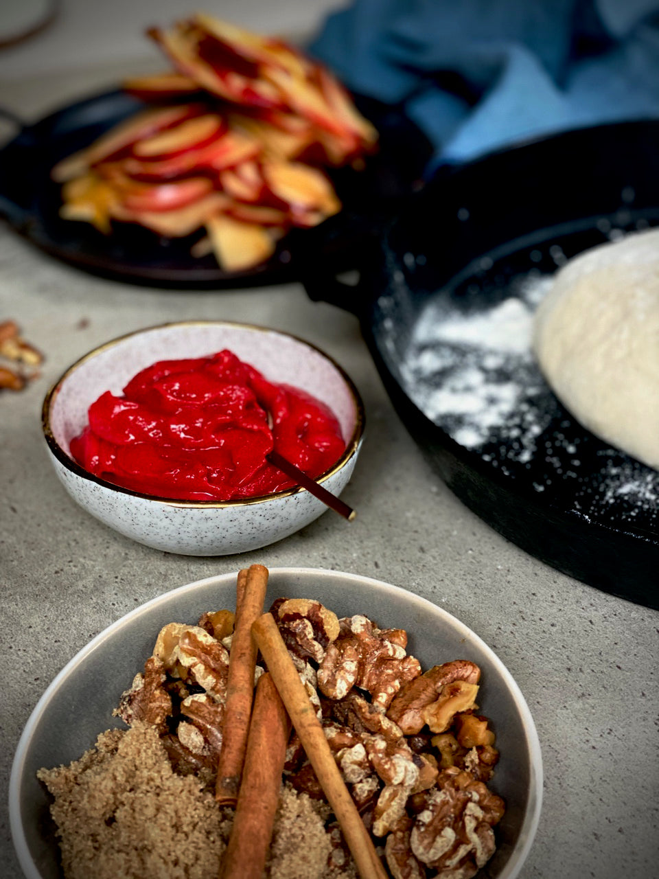 Let’s eat focaccia for pudding. This light as air bread base layered with fragrant raspberry and lemon curd, crisp apples and crunchy walnuts is a show-stopper. Never made curd before? It’s so easy and so much more delicious than anything you’ll buy in store. So get whisking and whizz up this dish for the people you love. They will love you even more after that first bite.