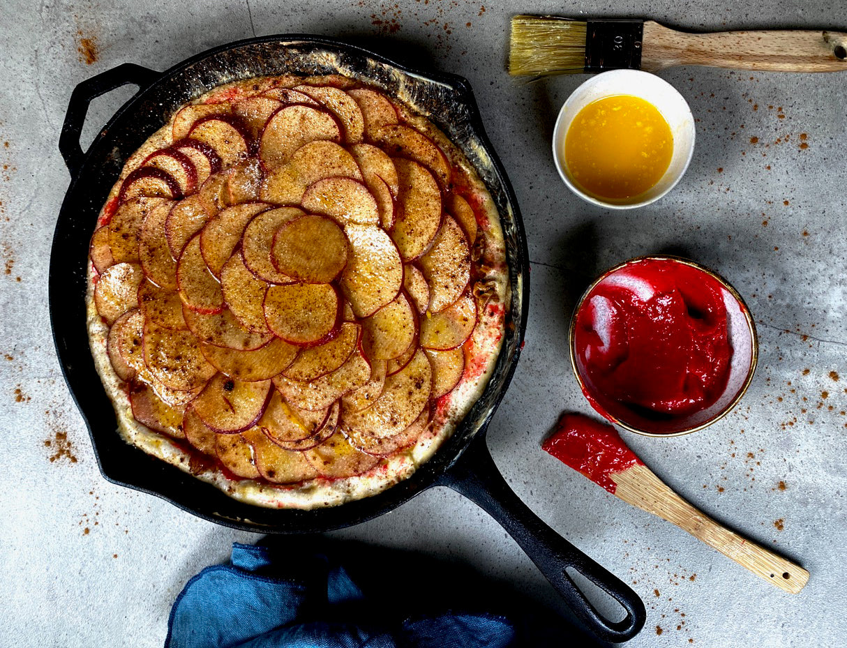 Lay the apple slices on top of the dough, starting at the outside edge and working into the middle. Brush the apples and dough edges with melted butter and finish with a sprinkling of cinnamon and sugar.
