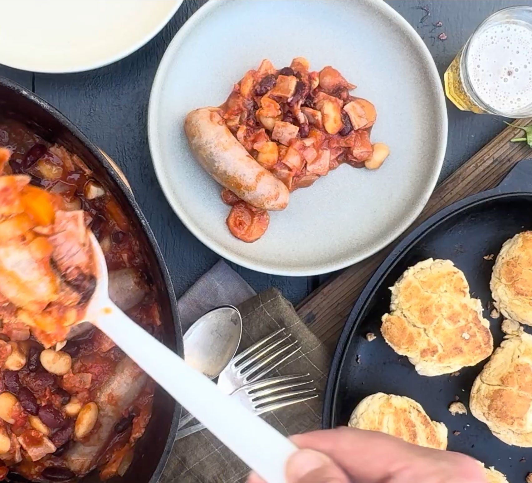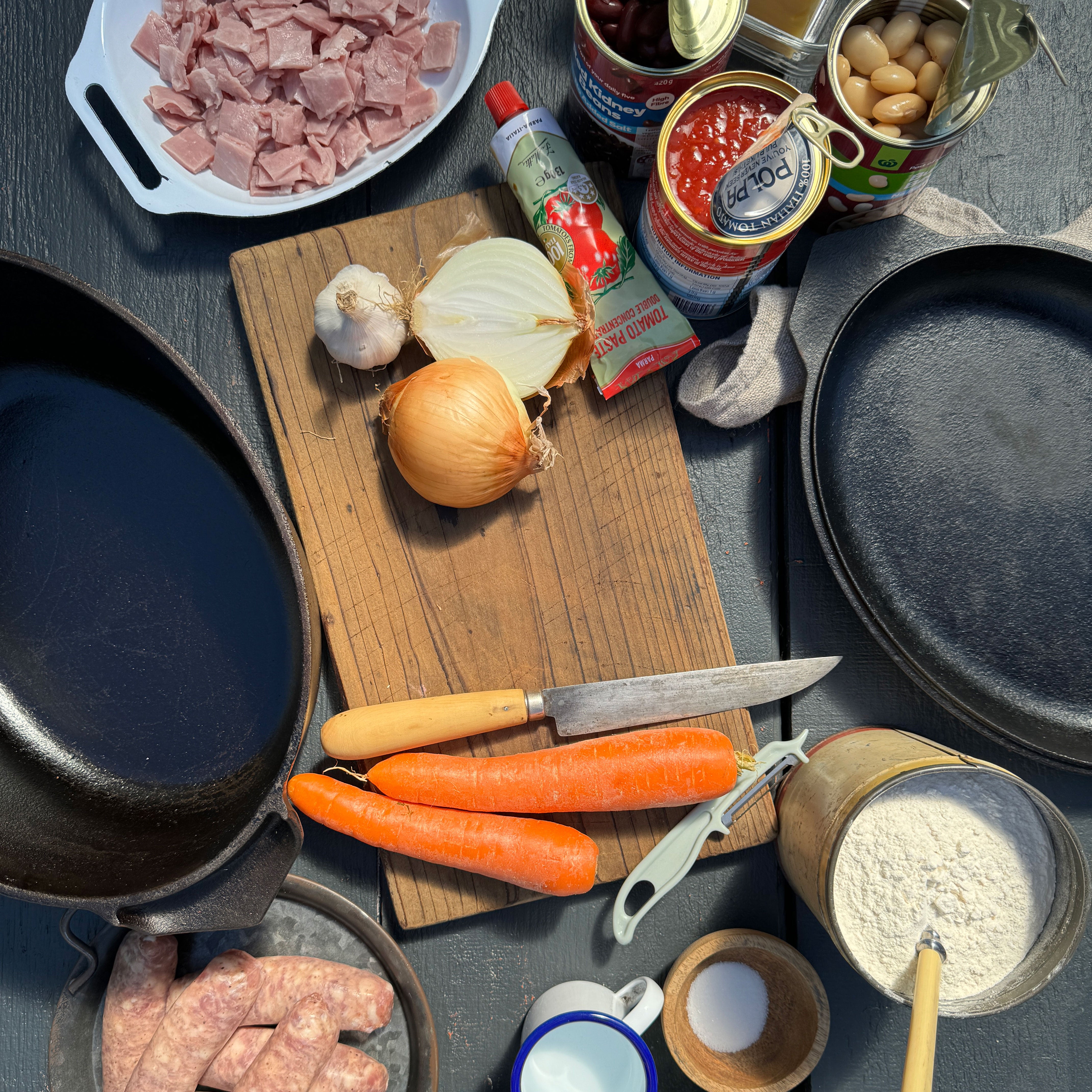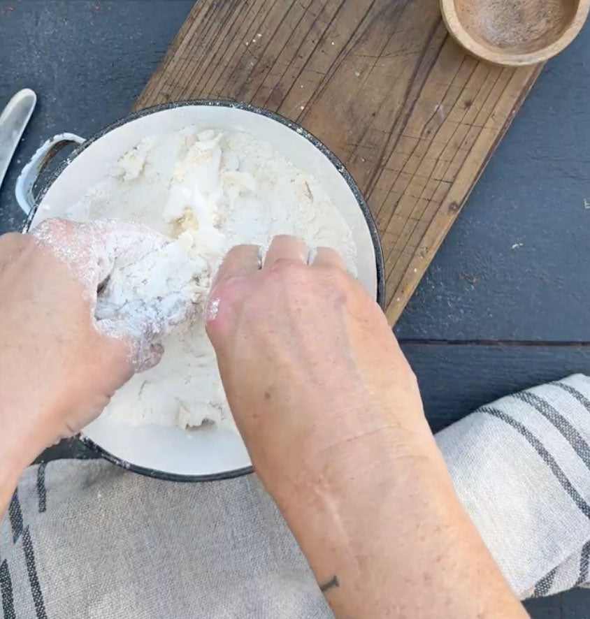 Place inverted lid on Ironclad Dutch Oven, reduce heat to low and leave to cook for 30 minutes. While the stew is cooking, make the damper dough.