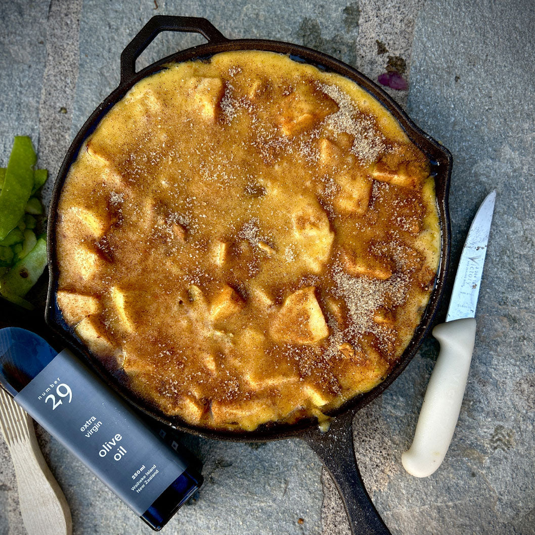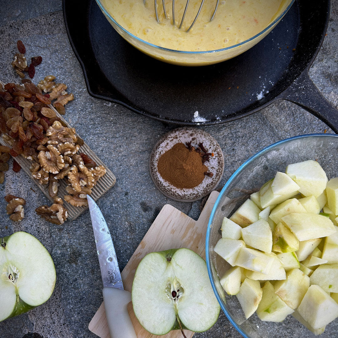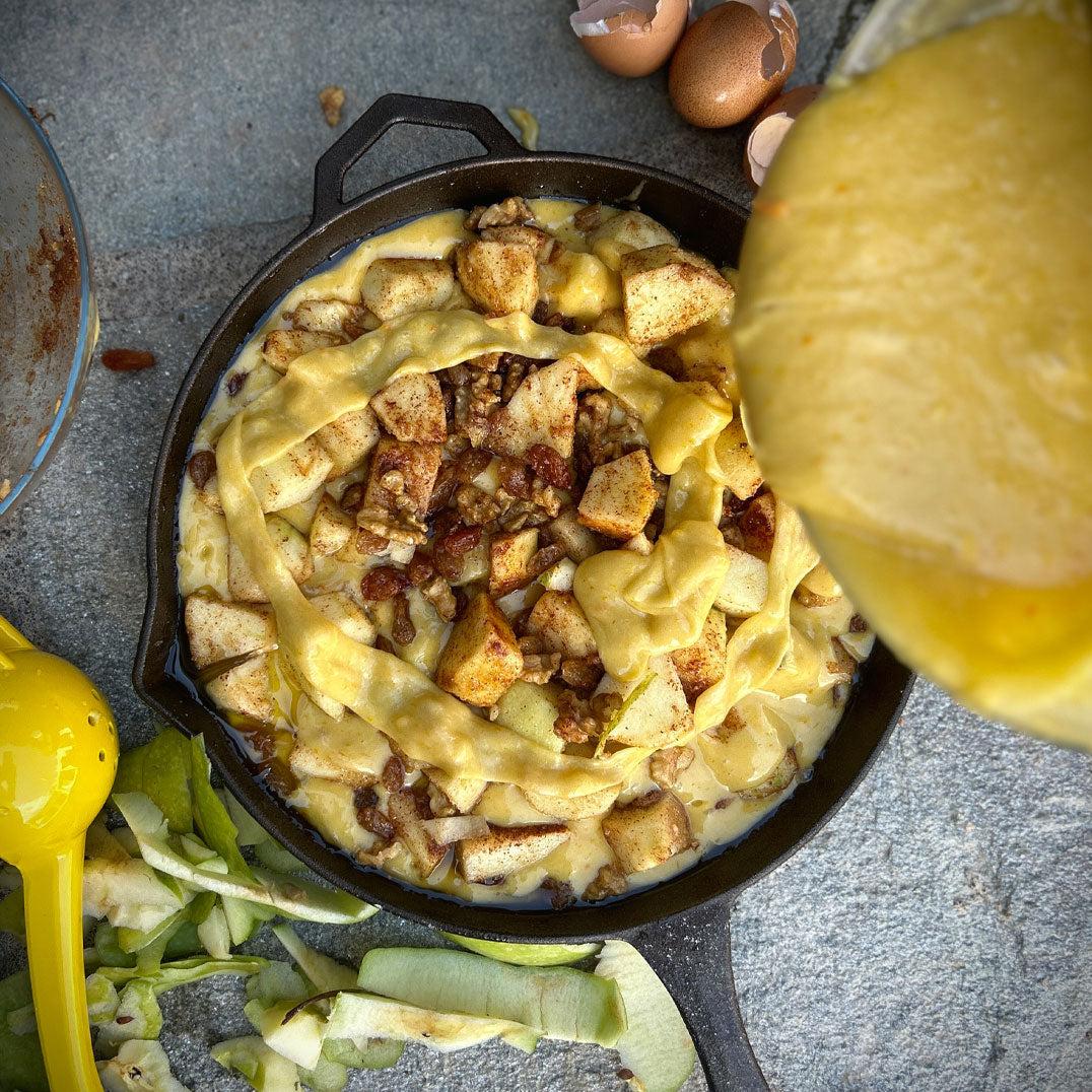 Grease the bottom and sides of your Ironclad Legacy Pan with 2 tablespoons of olive oil then pour in a third of the cake batter. Distribute half the apple mix on top of the batter, then repeat with another third of the batter, then another layer of apples and finish with the remaining batter.