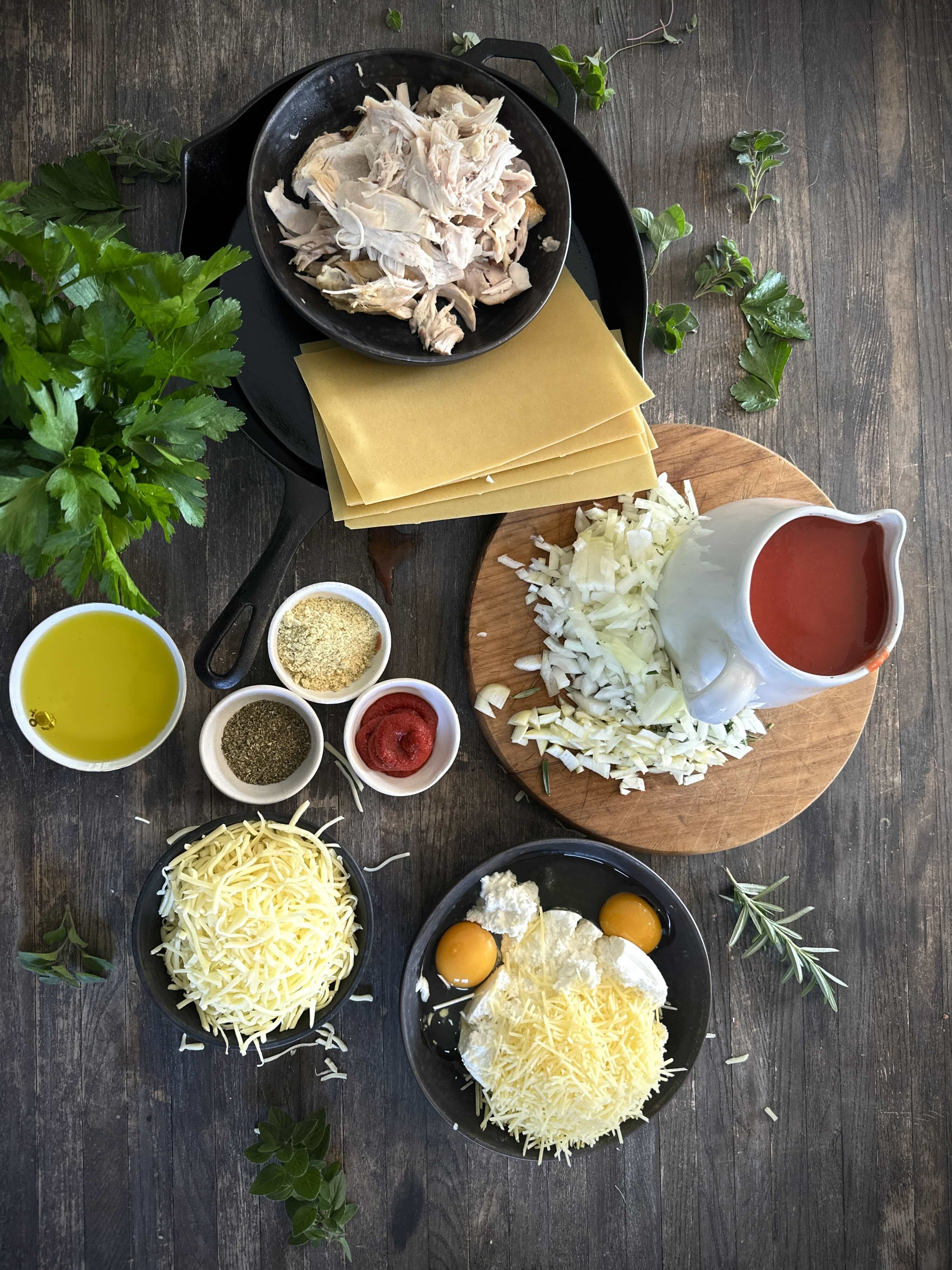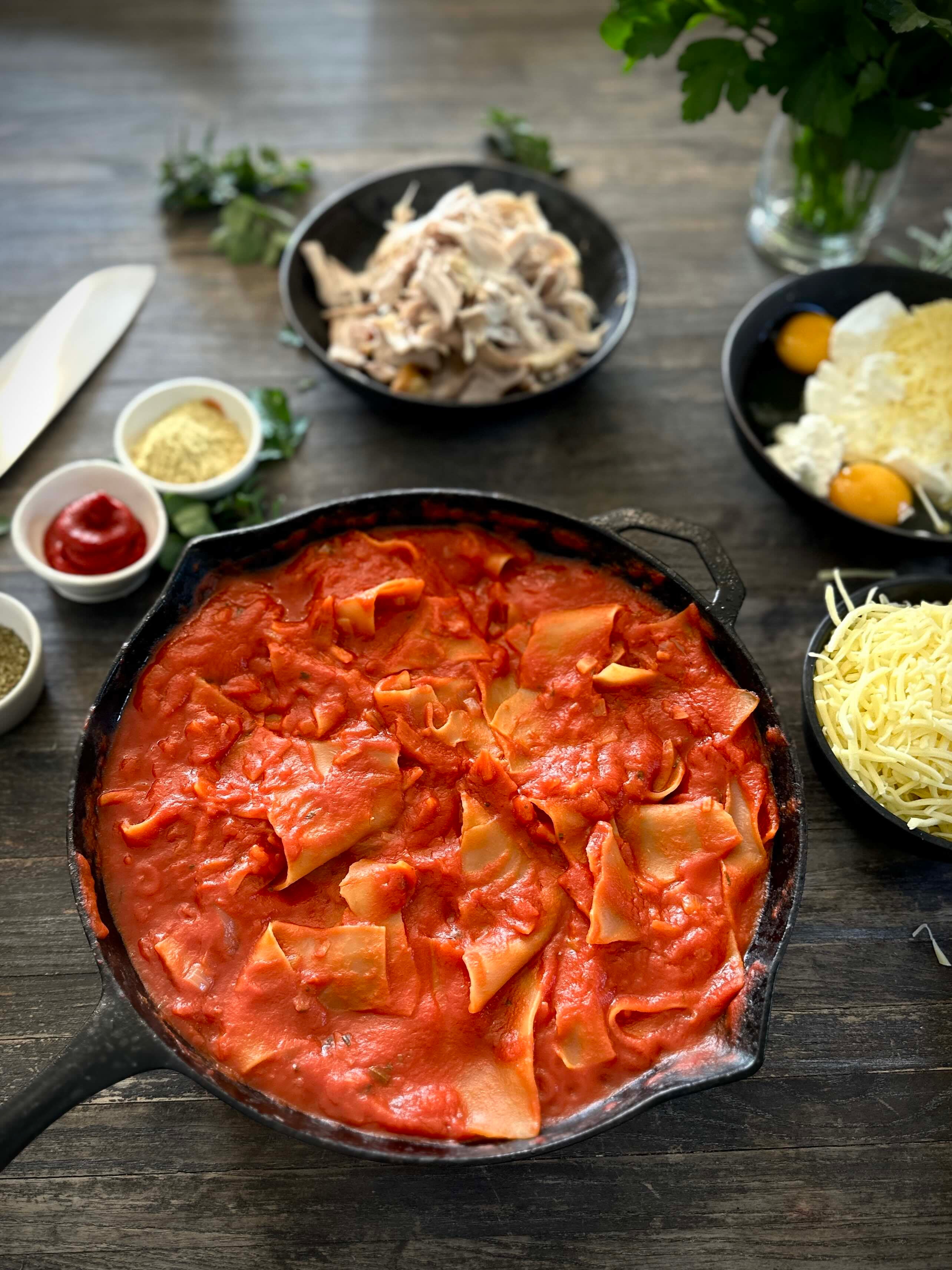 Lasagne just got RIDICULOUSLY easy! Cook the lasagne sheets in a rich tomato sauce, add shredded roast chook, smother in cheese. Bake.