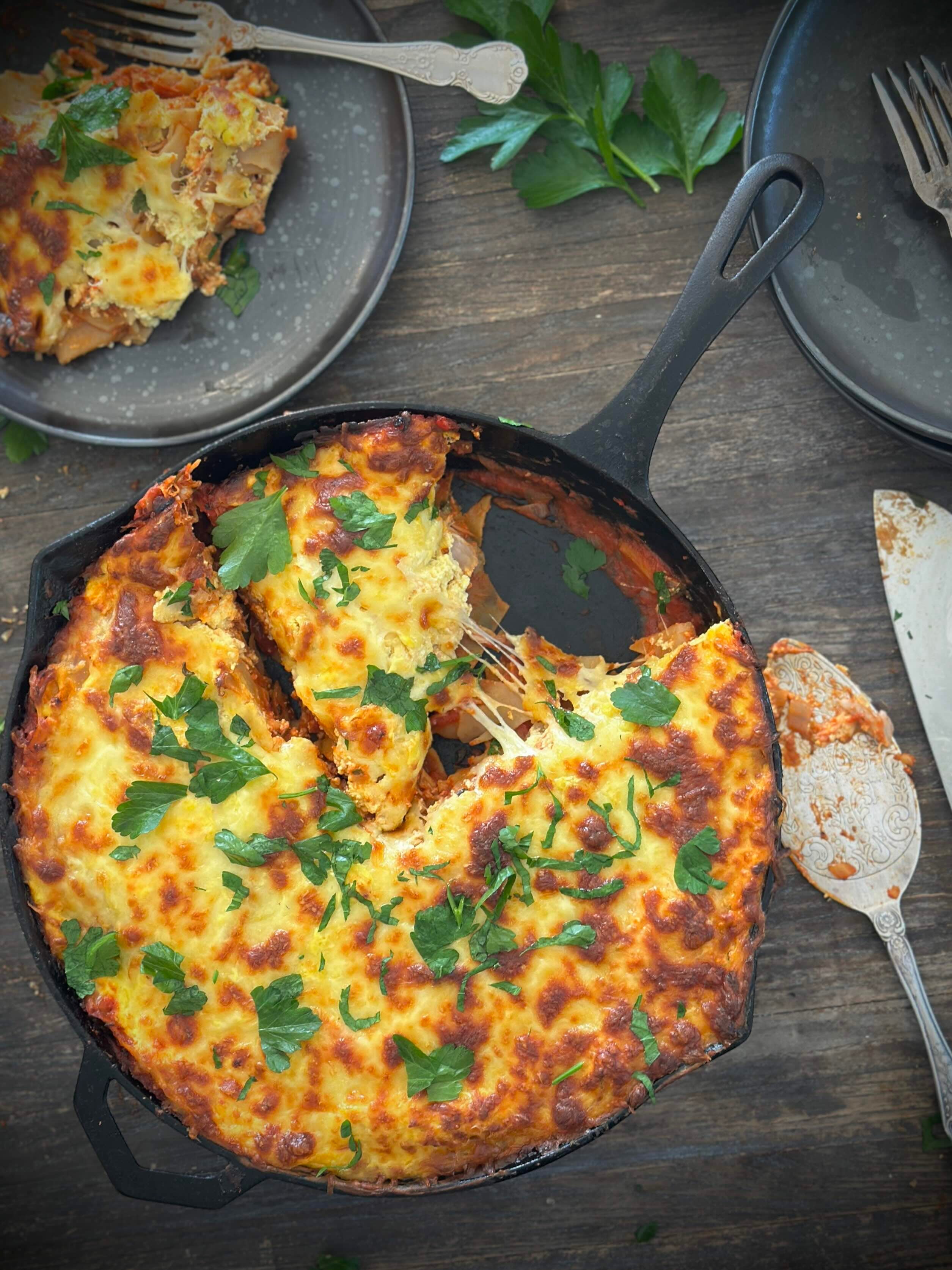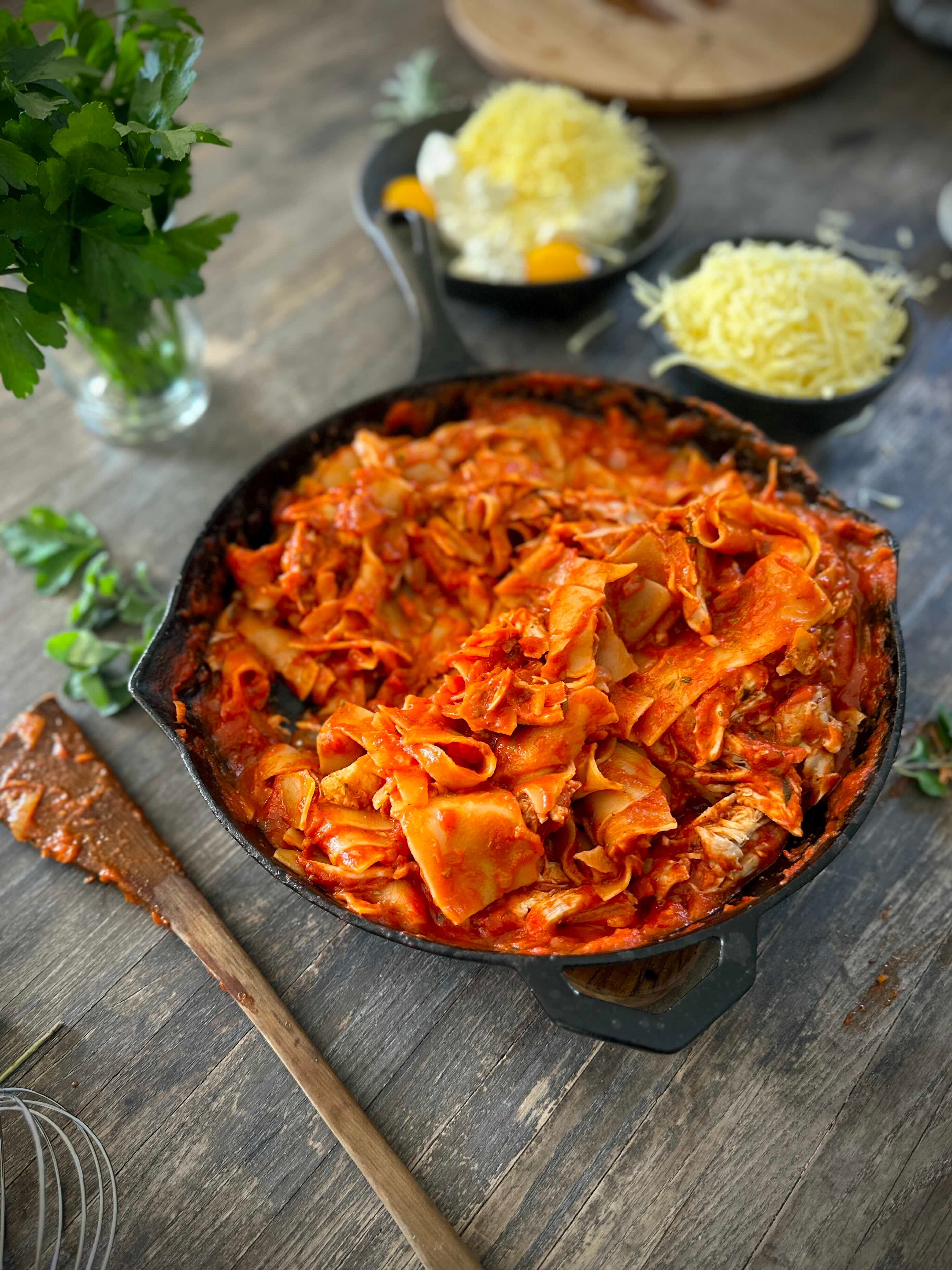 Add the pasta sheets to the pan pushing into the tomato mix as you go. Bring back up to a simmer. Cover and stir gently and often to avoid the sheets sticking together. Cook about 10 minutes until the pasta is nearly el dente.