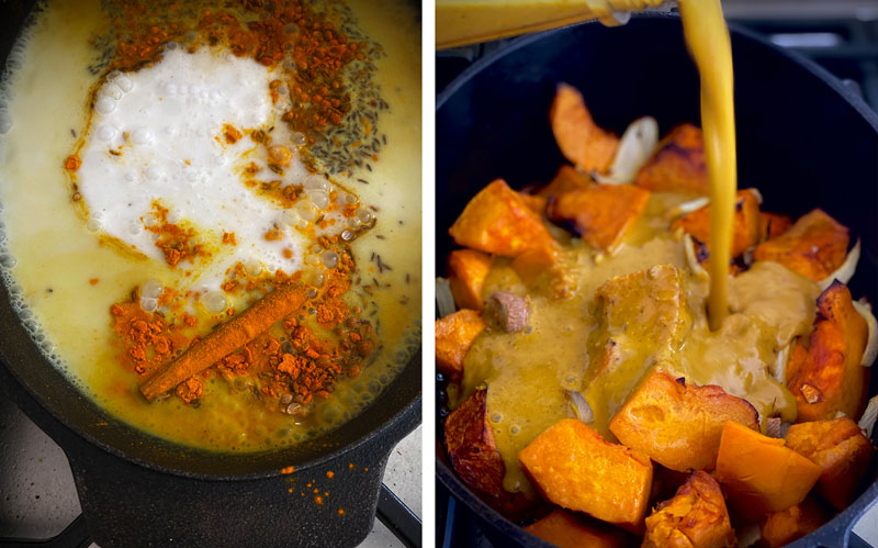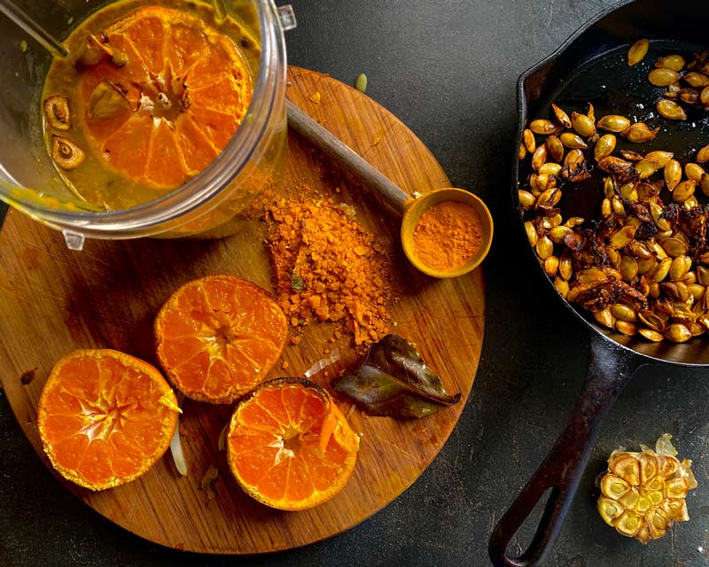On the stove top, heat the Old Dutch Lid till smoking. Turn heat to low, toss in the spices and stir for 1 minute or until you can smell the releasing aromas. Do not let it burn! Pour in the coconut milk and simmer for 2 minutes. Transfer the mix to a bowl and leave to cool down a little. When cooled, pour the mix into a Nutribullet or blender with the roasted mandarins and blend until very smooth and creamy.