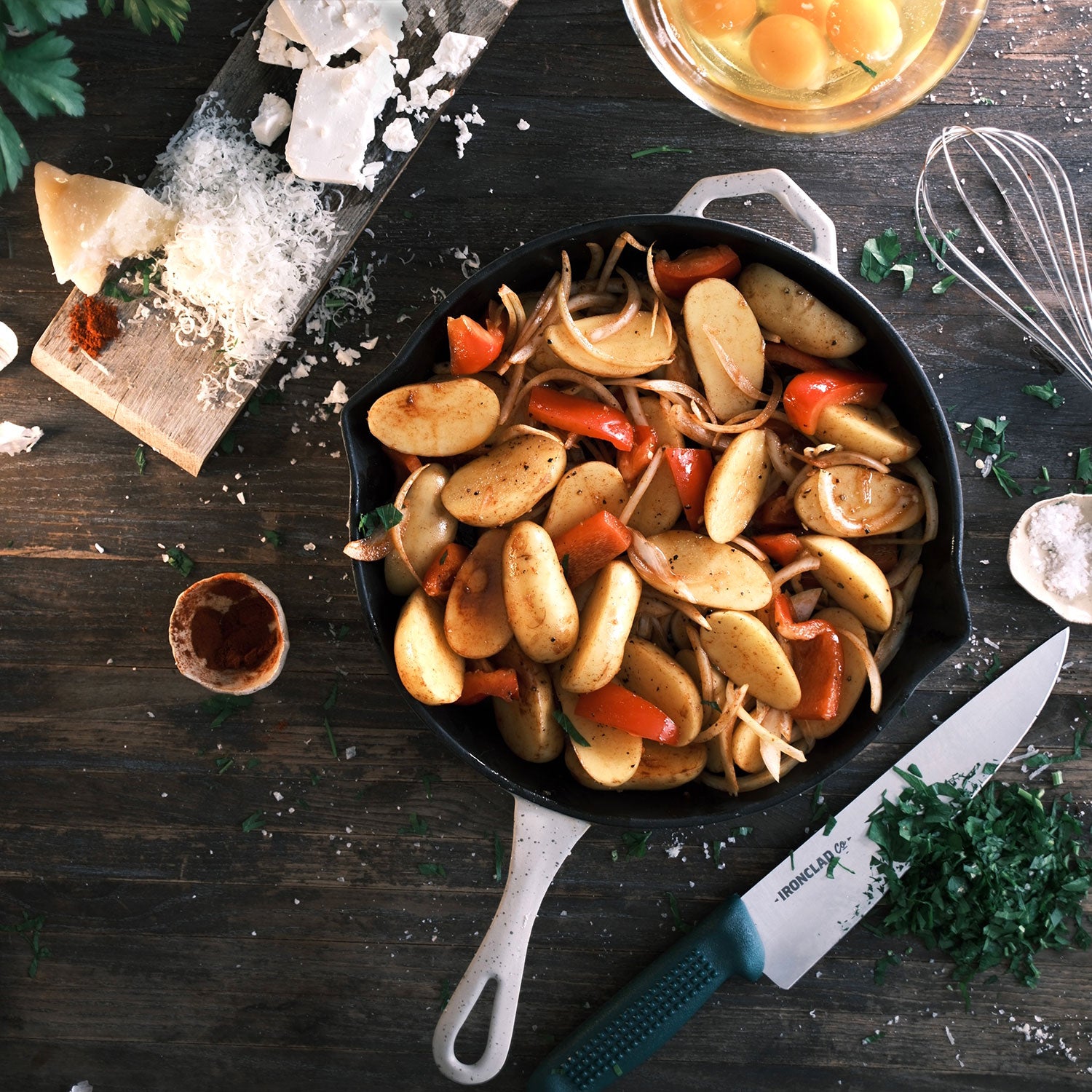 In your Ironclad Legacy Pan, toss together the potatoes, onions, red pepper, garlic, smoked paprika oregano and olive oil. Roast for 30 minutes until the potatoes are crunchy and golden brown.