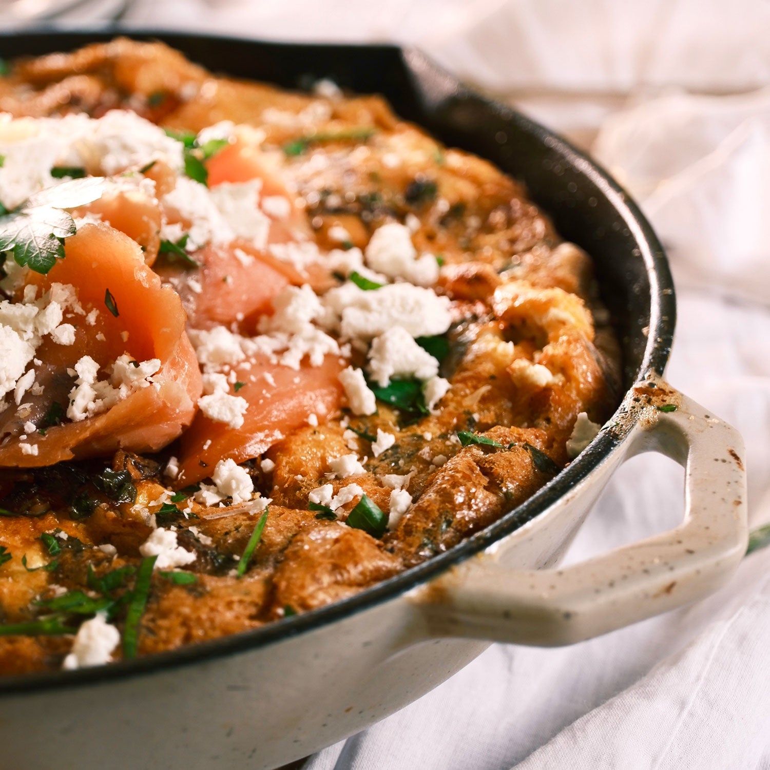 Arrange the smoked salmon and fresh crumbled feta in the centre of the frittata and finish with a sprinkle of parsley and a squeeze of lemon juice.